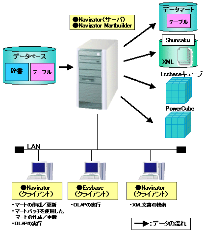 データマート生成機能(Martbuilderと呼ぶこともあります。)とは、Navigator辞書管理ツールで公開されているテーブルから、新しくデータマートとして公開用テーブルを出力する機能です。この機能により、部門サーバやスタッフ向けサーバ用のデータのセットアップを容易にします。