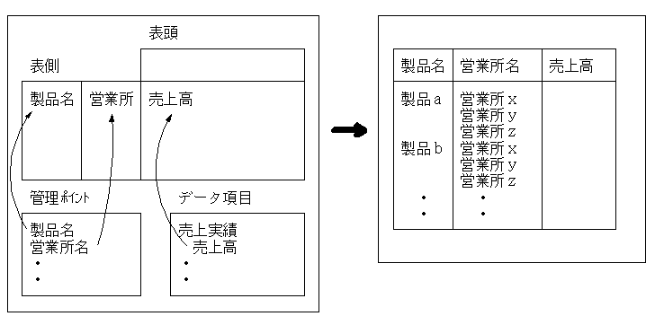 「製品」・「営業所」ごとの「売上高」が集計・加工されます。