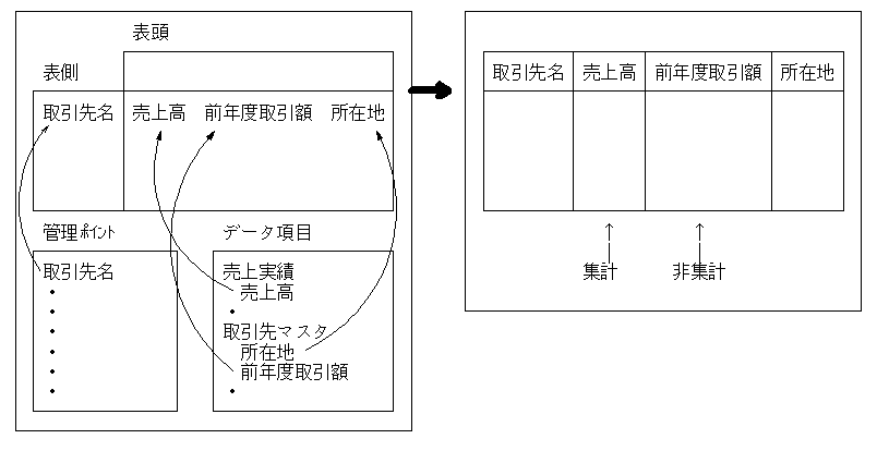 取引先マスタに前年度取引額や所在地がある場合は、単純な結合では前年度取引額が結合集計処理されるため、正しい結果が得られません。マスタテーブルに配置された付帯情報(前年度取引額や所在地など)は、集計・加工の対象から除外し、その結果に付帯情報をマージする方式を採用しています。