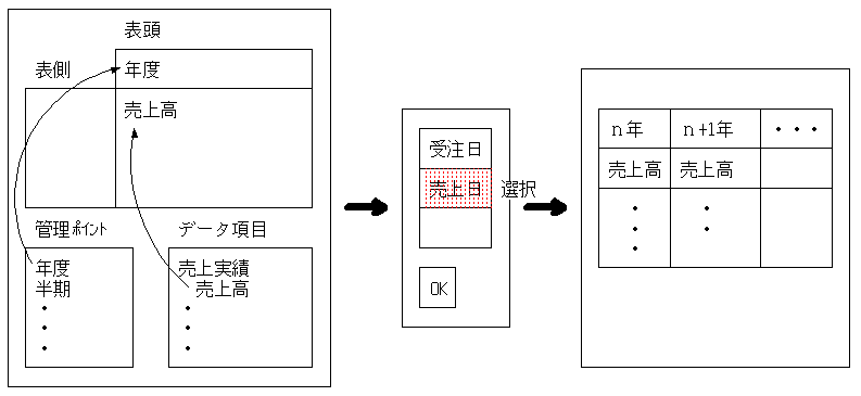 1つの実データテーブルに受注情報(受注日と受注金額)と売上情報(売上日と売上金額)が配置されている場合、集計・加工の対象によって、時間を使い分ける必要があります。実データテーブルに複数の時間項目があり、その特定ができない場合は、どの時間項目を採用するかを、利用者に問い合わせる方式を採用しています。