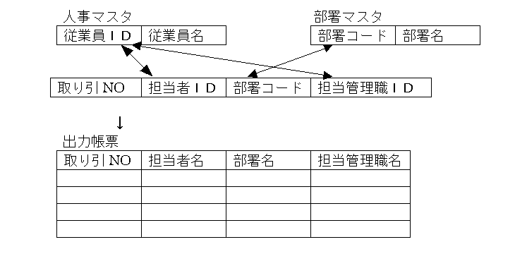 重複結合型は、マスタテーブルの1つの項目が、実データテーブルの複数の項目と結合されるパターンです。