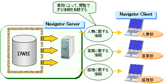 Navigatorでは、「データの非公開/公開」機能、「テーブルの公開条件」機能によって、権限を設定して、閲覧できるデータを制御することができます。
