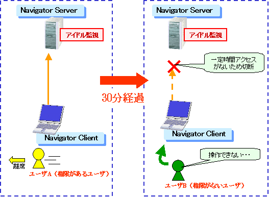 アイドル監視は、利用者の不注意で切断しなかった場合を考慮した機能です。利用者側には、離席する場合、「Navigator Serverから切断する」、「PCのパスワードロックを設定する」などのセキュリティへの配慮を指導してください。