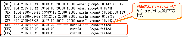 接続を許可している利用者から、接続されていることを確認してください。許可していないユーザ名がログに書き込まれている場合は、利用実態を調査するなどの対応をしてください。