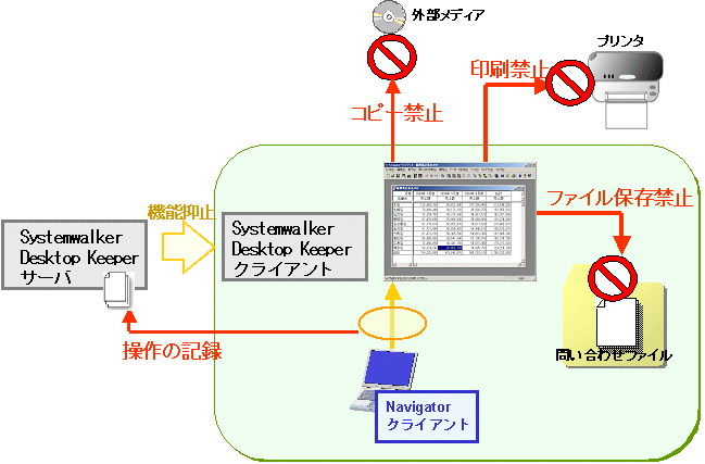 Systemwalker Desktop Keeper連携では、Systemwalker Desktop Keeperの抑止機能を利用して、流出される危険のある行為(外部メディアへのコピー、プリンタへの印刷、ファイルの保存など)を抑止することで、情報流出の可能性を少なくします。
