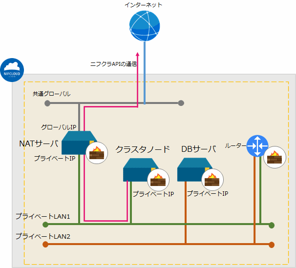 NATサーバによる接続性確保 | ルーター機能を使用せずにセキュアにバックエンドサーバの接続性を確保したい場合 | NATサーバは、ユーザによる構築・運用管理が必要です。 以下のように、ルーター機能ではできない構成の場合は、NATサーバによる接続性確保を利用します。 ・DNATとSNATで異なるグローバルIPを使用するなど、複数のグローバルIPをサーバに直接割り当てることなく使用したい場合 ・“図8.1 すでにルーターを使用している環境でプライベートLAN1だけをインターネットに接続したい場合”のように、すでにルーターを使用している環境でインターネットに接続したい場合 |