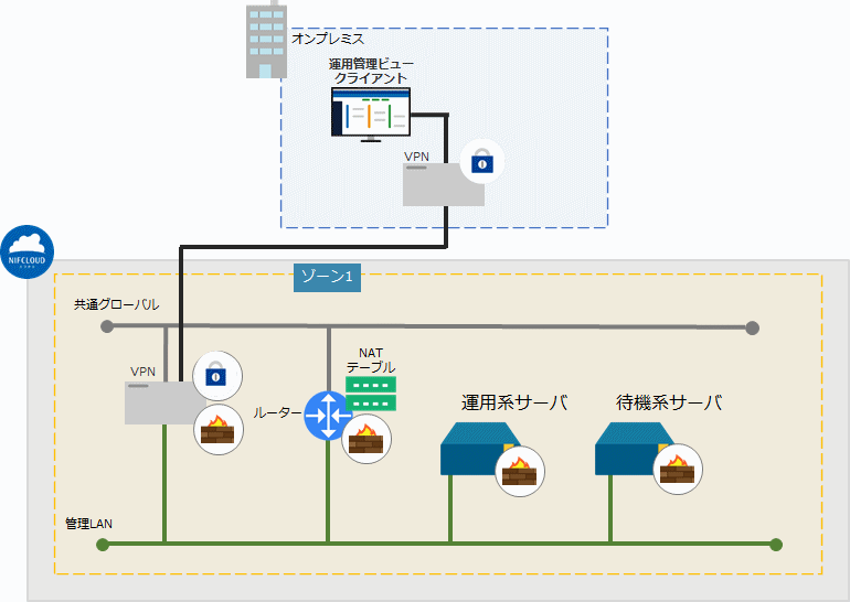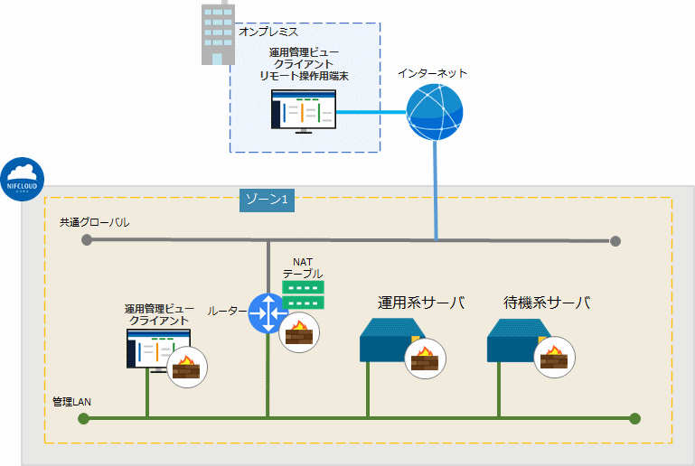 ニフクラ上に運用管理ビュークライアントを用意する必要はありません。 また、ニフクラ上の環境にセキュアに接続可能です。