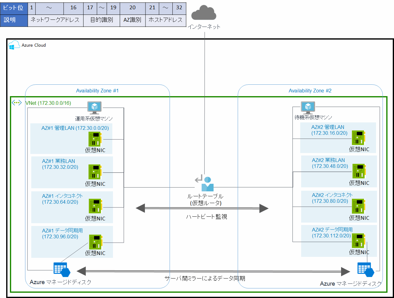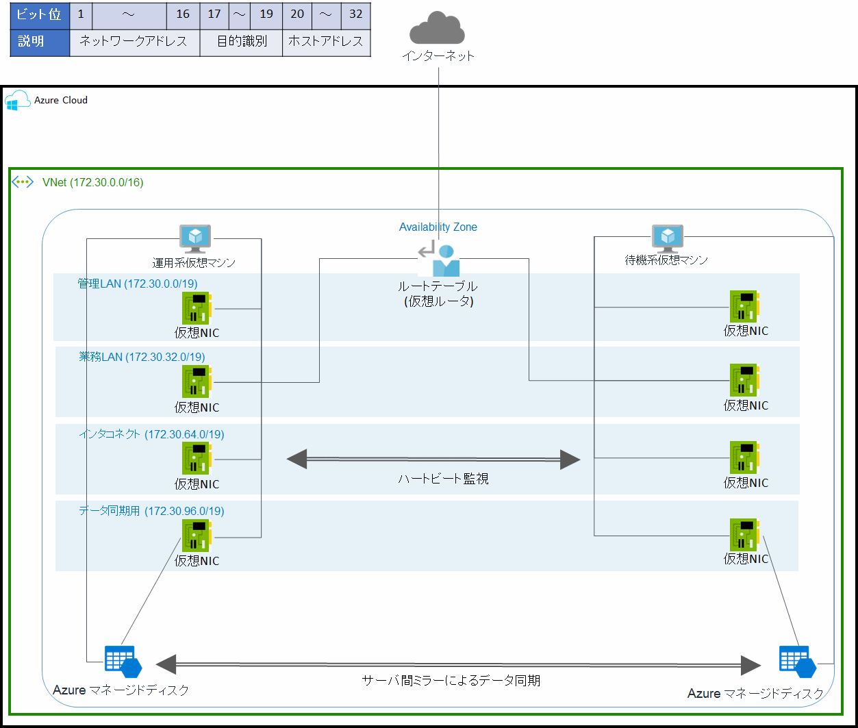 マルチアベイラビリティゾーンでのクラスタシステムの場合、仮想ネットワークを用意し、目的ごとにサブネットを作成します。