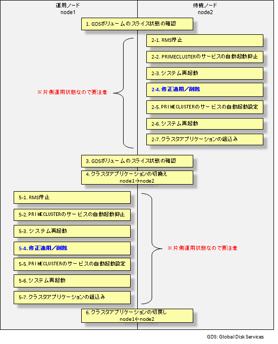 Azure環境でクラスタシステムに集約修正などの各種修正を適用する場合の手順概要を示します。GDSを使用していない環境では、GDS関連の手順は不要です。