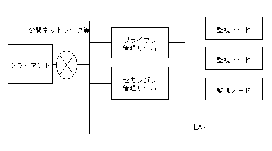2本のLANでWeb-Based Admin Viewを運用する形態です。サーバ−監視ノード間の通信に使用するLANとクライアントのWebブラウザで使用するLANを分離する形態です。クライアントを公開ネットワーク等から利用する場合にはセキュリティを考慮し、この運用形態を採用することをお勧めします。