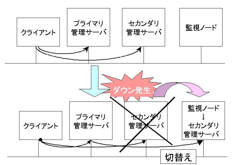 これはセカンダリ管理サーバがダウンしてしまった場合、もしくは、プライマリ管理サーバとセカンダリ管理サーバの両方がダウンしてしまった場合等に、その他の稼働中の監視ノードから1台を選出し、そこにセカンダリ管理サーバの機能を譲渡することで高信頼性を実現するものです。