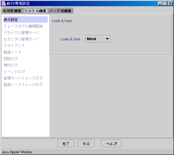 画面のLook & FeelをMetal (デフォルト)、CDE/Motif、Windows、Any (クライアントのOS(Operating System)に依存)のいずれかを選択します。