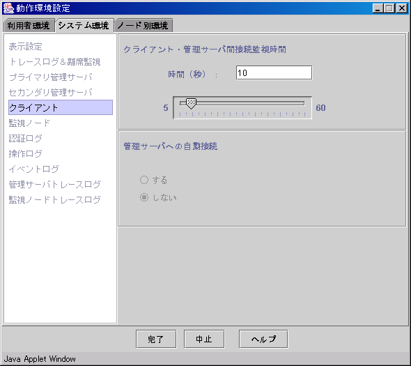 クライアント・管理サーバ間接続監視時間の設定と管理サーバへの自動接続設定の表示を行います。