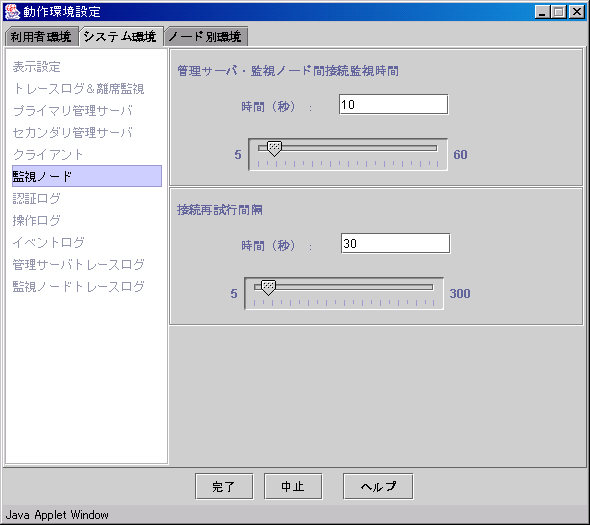 管理サーバ・監視ノード間接続監視時間、接続再試行間隔を設定します。