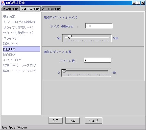 管理サーバの認証ログファイルのサイズ、個数を設定します。