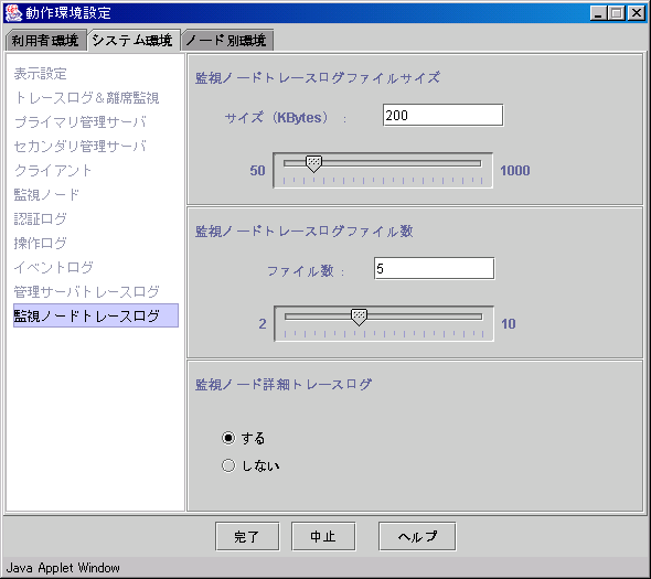 監視ノードトレースログファイルのサイズと個数の設定、監視ノード詳細トレースログを収集するかどうかを設定します。