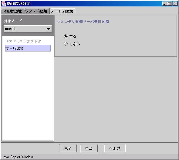 [対象ノード]で選択した監視ノードを、セカンダリ管理サーバとして自動的に選出するかどうかを指定します。初期値は"する"です。