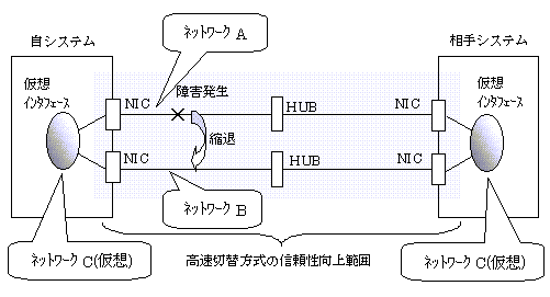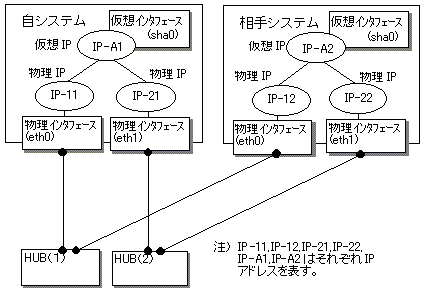 また、複数のNICを論理的に1本に見せるための仮想的なインタフェース(以下、仮想インタフェースと呼びます)を生成します。TCP/IPアプリケーションは、この仮想インタフェースに設定されたIPアドレス(以下、仮想IPアドレスと呼びます)を自システムのIPアドレスとして使用することにより、物理的なネットワークの冗長構成を意識することなく相手システムと通信を行うことが可能となります。