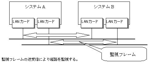 - 一定間隔(デフォルトは5秒。hanetparamコマンドにより変更可能)で相手システムのNIC宛に専用の監視フレームを送信し、応答を待ちます。応答があった場合にはその伝送路は正常と判断し、次の監視までの間、通信に使用されます。応答がなかった場合には異常が発生していると判断し、次の監視時に正常と判断されるまでは通信には使用されません。なお監視は、相手装置が実装しているNIC単位に行われます。