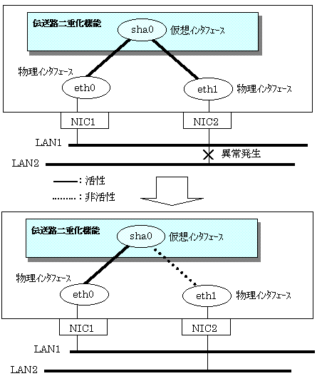 - 障害が発生した物理インタフェースの伝送路が復旧した場合には、その物理インタフェースは自動的に通信に利用されるようになります。また、手動で切り離しを行った場合には、手動で切戻しを行い、元の状態に戻す必要があります。