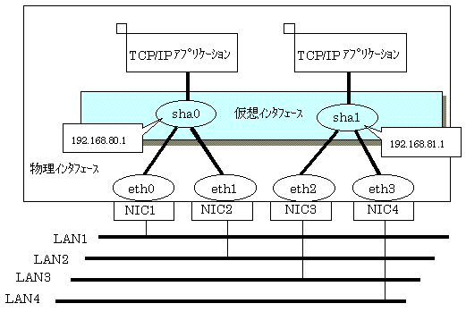 以下の図2.12に、仮想インタフェースを2つ定義した場合の定義例を示します。なお、sha0,sha1には、異なるサブネットの仮想IPアドレスを設定します。