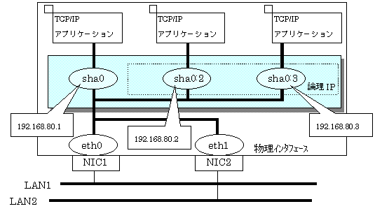 以下の図2.16に、仮想インタフェースsha0に論理仮想インタフェースを2つ定義した場合の例を示します。sha0,sha0:2,sha0:3には、すべて同じサブネットのIPアドレスを設定します。