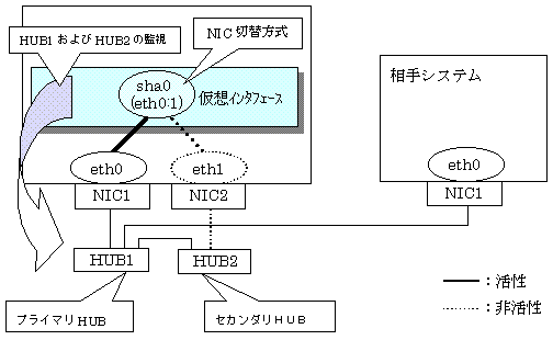 HUB監視機能とは、近隣のHUBに対してpingを一定間隔で実行し、伝送路に異常を検出した場合に使用するインタフェースを切替える機能です。1つの仮想インタフェースにつき2台まで登録が可能です。本機能は、NIC切替方式の場合のみ使用できます。