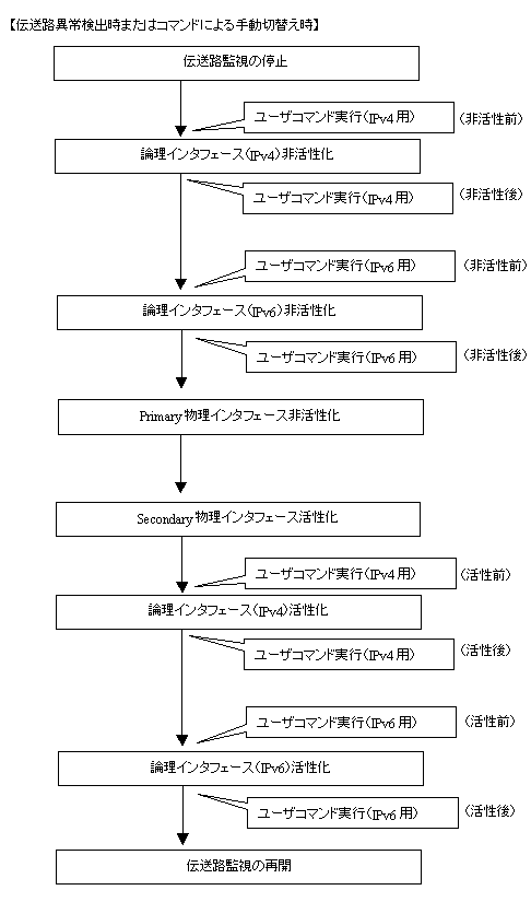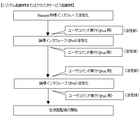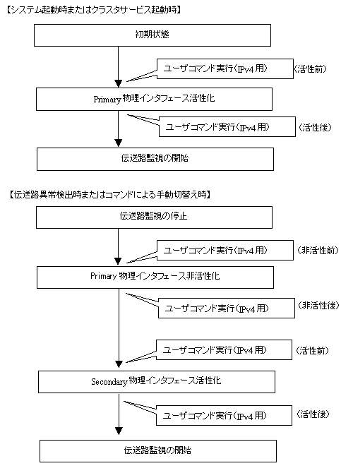 伝送路監視異常(LAN異常、HUB異常等)による自動切替えや、運用コマンド実行(活性、非活性や手動切替え)により、論理IPアドレス(論理IPアドレス引継ぎ機能使用時)または物理IPアドレス(物理IPアドレス引継ぎ機能使用時)の活性化や非活性化が行われた場合に、ユーザが指定したコマンドを実行します。