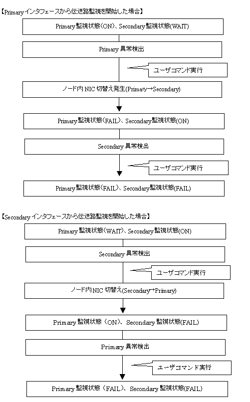 図2.29に、 NIC切替方式における待機パトロール異常、復旧検出時のユーザコマンド実行タイミングを示します。