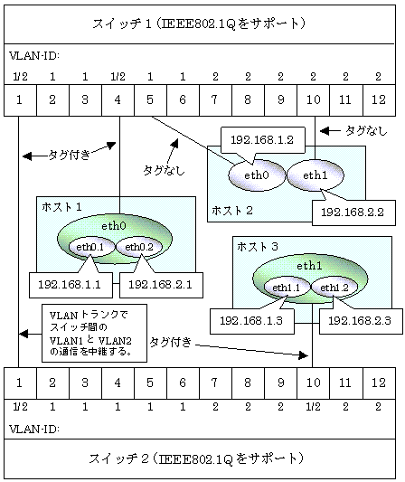 ホスト1の物理インタフェース“eth0”上に、VLAN1とVLAN2に属する論理的なインタフェース“eth0.1”と“eth0.2”を作成することにより、タグ付きパケットの通信を行います。