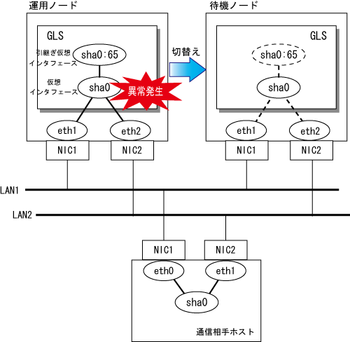 クラスタ切替え対象となる引継ぎ仮想インタフェースの論理ユニット番号は、65以降が使用されます。(sha0:65、sha0:66等)