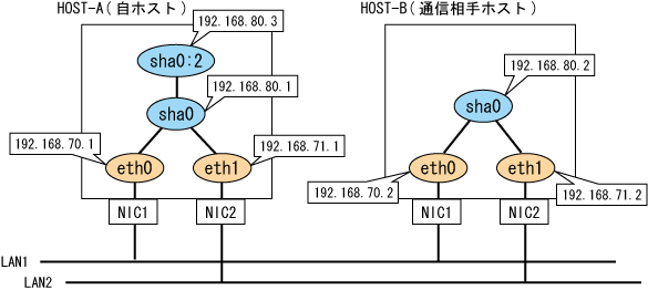 192.168.70.1 host11 # HOST-Aの物理IPアドレス 192.168.71.1 host12 # HOST-Aの物理IPアドレス 192.168.80.1 hosta # HOST-Aの仮想IPアドレス 192.168.80.3 hosta1 # HOST-Aの論理仮想IPアドレス 192.168.70.2 host21 # HOST-Bの物理IPアドレス 192.168.71.2 host22 # HOST-Bの物理IPアドレス 192.168.80.2 hostb # HOST-Bの仮想IPアドレス |