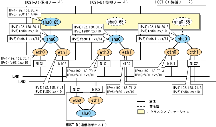 192.168.70.1 host11 # HOST-Aの物理IPアドレス 192.168.71.1 host12 # HOST-Aの物理IPアドレス 192.168.80.1 hosta # HOST-Aの仮想IPアドレス 192.168.70.2 host21 # HOST-Bの物理IPアドレス 192.168.71.2 host22 # HOST-Bの物理IPアドレス 192.168.80.2 hostb # HOST-Bの仮想IPアドレス 192.168.70.3 host31 # HOST-Cの物理IPアドレス 192.168.71.3 host32 # HOST-Cの物理IPアドレス 192.168.80.3 hostc # HOST-Cの仮想IPアドレス 192.168.80.4 hosta1 # HOST-A/B/Cの引継ぎ仮想IPアドレス fec0:1::4 v6hosta1 # HOST-A/B/Cの引継ぎ仮想IPアドレス |
