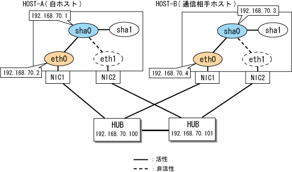 192.168.70.1 hosta # HOST-Aの仮想IPアドレス 192.168.70.2 host11 # HOST-Aの物理IPアドレス 192.168.70.3 hostb # HOST-Bの仮想IPアドレス 192.168.70.4 host21 # HOST-Bの物理IPアドレス 192.168.70.100 swhub1 # primary監視先HUBのIPアドレス 192.168.70.101 swhub2 # secondary監視先HUBのIPアドレス |