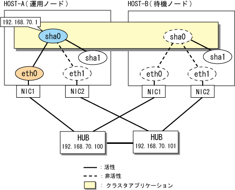 192.168.70.1 hosta # HOST-A/Bの仮想IPアドレス(引継ぎIPアドレス) 192.168.70.100 swhub1 # primary監視先HUBのIPアドレス 192.168.70.101 swhub2 # secondary監視先HUBのIPアドレス |