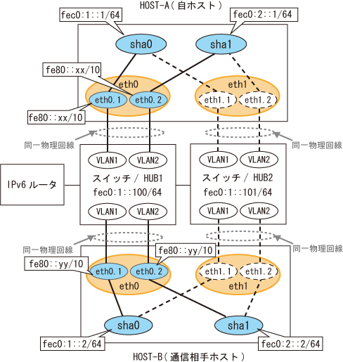 fec0:1::1 v6hosta1 # HOST-Aの仮想IP(1) fec0:2::1 v6hosta2 # HOST-Aの仮想IP(2) fec0:1::2 v6hostb1 # HOST-Bの仮想IP(1) fec0:2::2 v6hostb2 # HOST-Bの仮想IP(2) fec0:1::100 swhub1 # primary監視先HUBのIP fec0:1::101 swhub2 # secondary監視先HUBのIP |