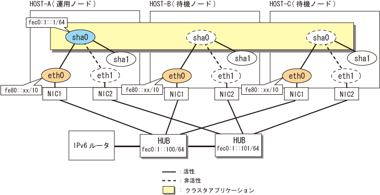 fec0:1::1 v6hosta # HOST-A/B/Cの引継ぎ仮想IPアドレス fec0:1::100 swhub1 # primary監視先HUBのIPアドレス fec0:1::101 swhub2 # secondary監視先HUBのIPアドレス |