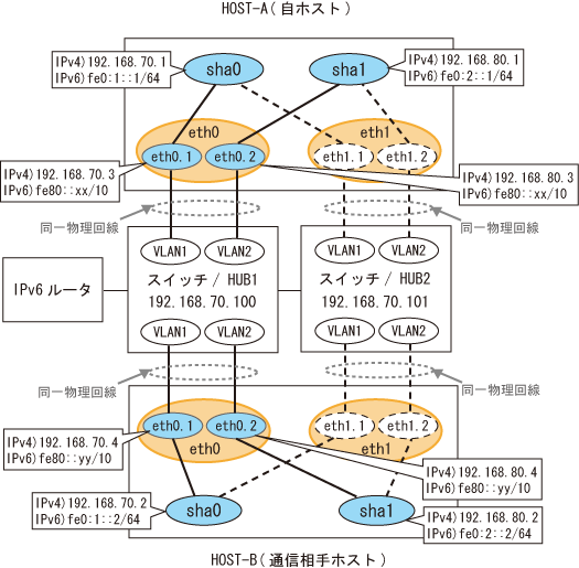 192.168.70.1 hosta # HOST-Aの仮想IP 192.168.70.3 host71 # HOST-Aの物理IP (タグVLANインタフェース) 192.168.80.1 hostb # HOST-Aの仮想IP 192.168.80.3 host81 # HOST-Aの物理IP (タグVLANインタフェース) 192.168.70.2 hostc # HOST-Bの仮想IP 192.168.70.4 host72 # HOST-Bの物理IP (タグVLANインタフェース) 192.168.80.2 hostd # HOST-Bの仮想IP 192.168.80.4 host82 # HOST-Bの物理IP (タグVLANインタフェース) 192.168.70.100 swhub1 # primary監視先スイッチ/HUBのIP 192.168.70.101 swhub2 # secondary監視先スイッチ/HUBのIP fec0:1::1 v6hosta1 # HOST-Aの仮想IP(1) fec0:2::1 v6hosta2 # HOST-Aの仮想IP(2) fec0:1::2 v6hostb1 # HOST-Bの仮想IP(1) fec0:2::2 v6hostb2 # HOST-Bの仮想IP(2) |