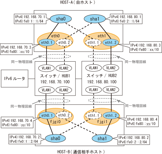 192.168.70.1 hosta # HOST-Aの仮想IP 192.168.70.3 host71 # HOST-Aの物理IP (タグVLANインタフェース) 192.168.80.1 hostb # HOST-Aの仮想IP 192.168.80.3 host81 # HOST-Aの物理IP (タグVLANインタフェース) 192.168.70.2 hostc # HOST-Bの仮想IP 192.168.70.4 host72 # HOST-Bの物理IP (タグVLANインタフェース) 192.168.80.2 hostd # HOST-Bの仮想IP 192.168.80.4 host82 # HOST-Bの物理IP (タグVLANインタフェース) 192.168.70.100 swhub1 # primary監視先スイッチ/HUBのIP 192.168.80.100 swhub2 # secondary監視先スイッチ/HUBのIP fec0:1::1 v6hosta1 # HOST-Aの仮想IP(1) fec0:2::1 v6hosta2 # HOST-Aの仮想IP(2) fec0:1::2 v6hostb1 # HOST-Bの仮想IP(1) fec0:2::2 v6hostb2 # HOST-Bの仮想IP(2) |