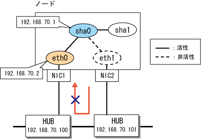 パターン1の場合、HUBの設定誤りやケーブルの接続誤りになどにより待機パトロールの監視フレームがプライマリNIC(eth0)に到達していない可能性があります。