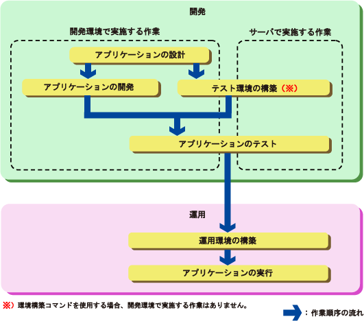 運用環境の構築方法、およびテスト済みのアプリケーションを運用環境に移行して配備する方法について説明します。